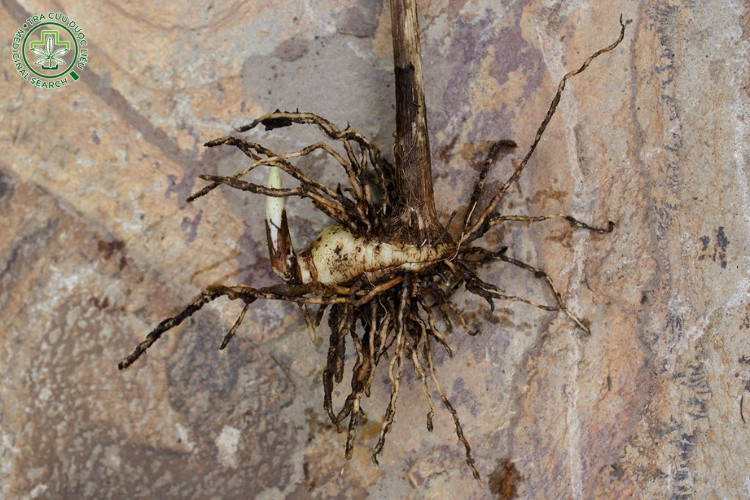 Rễ: Dạng khối củ dày, hình tam giác tròn, hơi dẹt, màu vàng trắng. Phần rễ nhỏ màu xám trắng, mảnh mai.