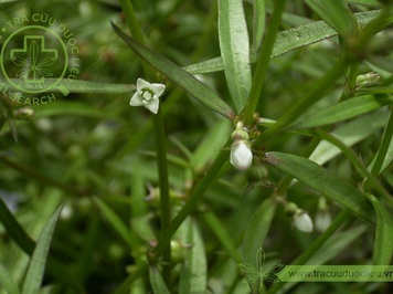 Hoa: Hoa màu trắng, ít khi hồng, có cuống, mọc đơn độc hoặc đôi một ở kẽ lá; lá đài 4, hình mác, mép có lông dạng mi; cánh hoa 4, hai mặt nhẵn, ống tràng dài 1,5mm; nhị 4, đính vào họng tràng; bầu có hai ô đựng nhiều noãn, đầu nhụy chia đôi.