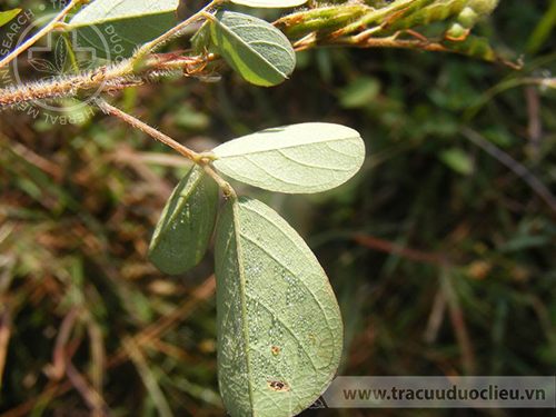- Lá mọc so le, cuống có lông trắng, 3 lá chét hình thuôn hoặc trái xoan ngược, dài 2,5 – 5 cm, rộng 1 – 2,5 cm, gốc tròn, đầu lõm có mũi lồi, lá chét tận cùng to hơn, mặt trên nhãn, mặt dưới có lông màu tro, gân chính chạy dọc theo mép lá, gân phụ thành mạng lưới rõ, cuống chung dài 2 – 2,5 cm, có lông trăng nhạt.