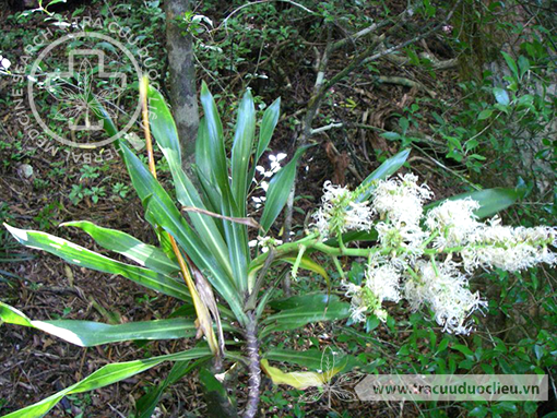 - Cụm hoa mọc ở ngọn thành chùm kép, dài khoảng 35-40cm, các nhánh dài tới 20cm; hoa màu trắng xanh, hình ống 6 thùy giống nhau, cùng màu; nhị 6, chỉ nhị hẹp; bầu hình trụ, 3 ô, mỗi ô có một noãn.